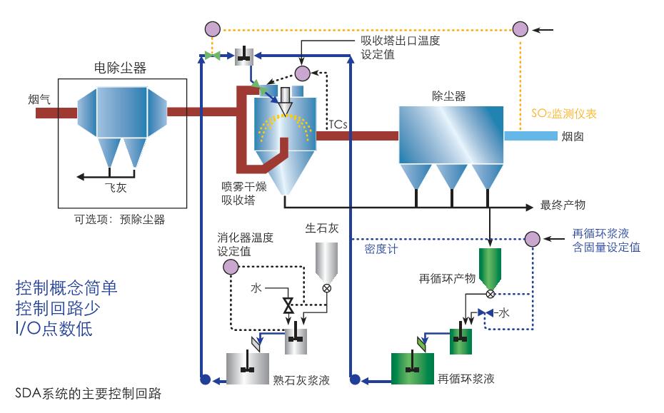 噴霧干燥法脫硫工藝系統的基本組成為:吸收劑漿液制備系統、噴 霧干燥吸收塔、袋式除塵器或電除塵器等。