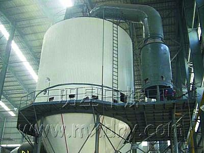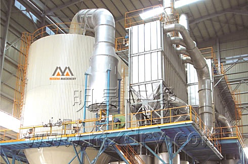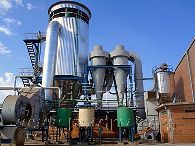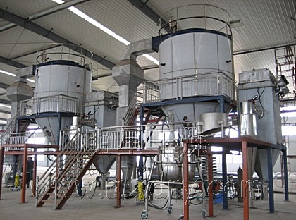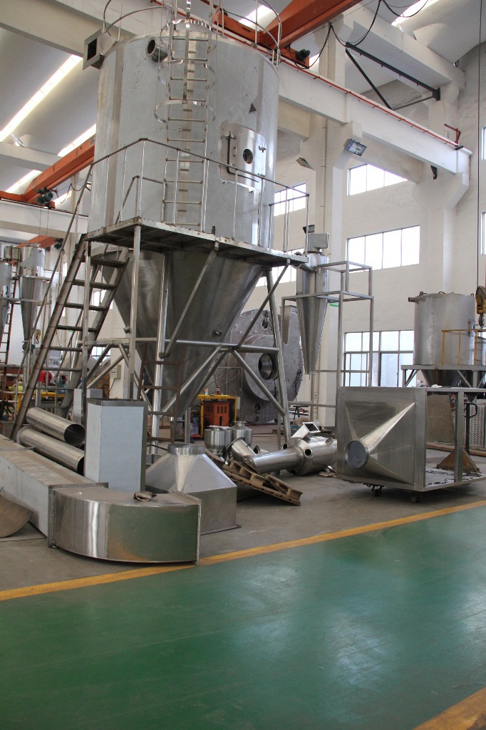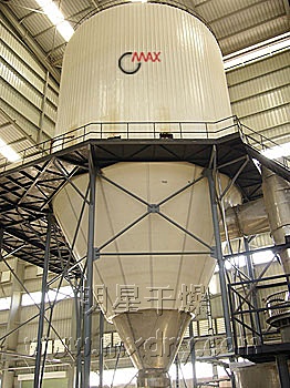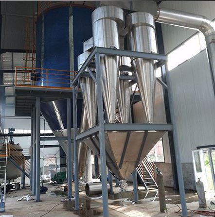 ??空氣經過濾和加熱,進入干燥器頂部空氣分配器,熱空氣呈螺旋狀均勻地進入干燥室。料液經塔體頂部的高速離心霧化器,(旋轉)噴霧成極細微的霧狀液珠,與熱空氣并流接觸在極短的時間內可干燥為成品。成品連續(xù)地由干燥塔底部和旋風分離器中輸出,廢氣由風機排空。
